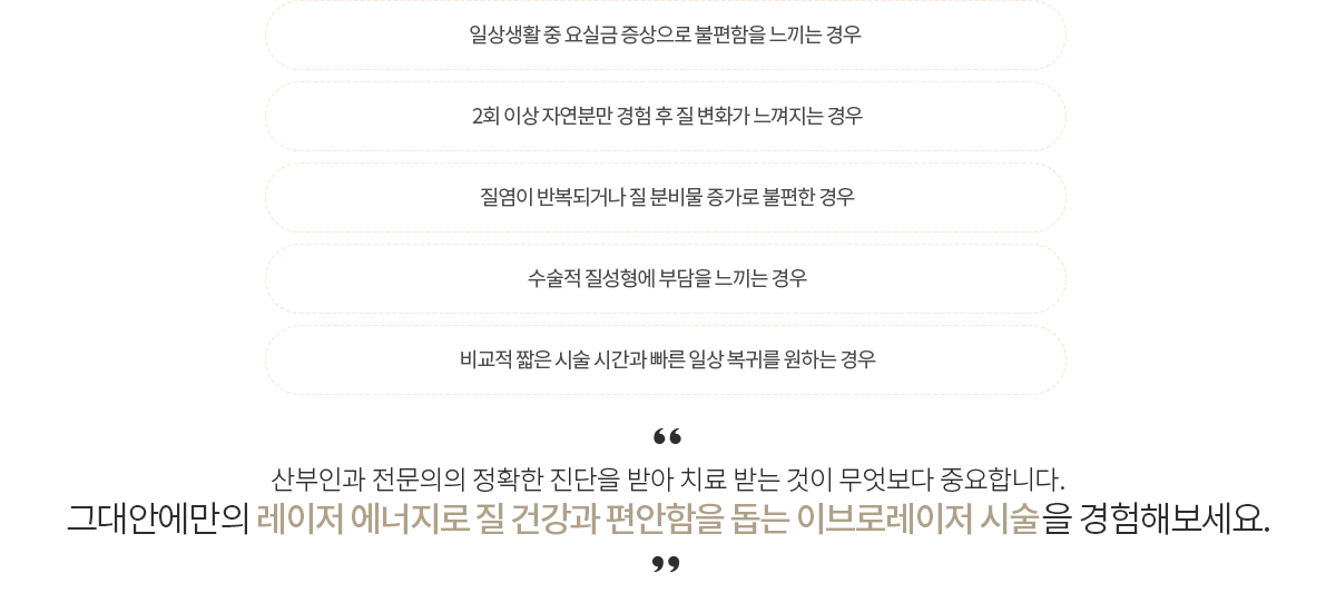 수술 없이 레이저 에너지를 이용해 질 점막의 콜라겐 재생과 탄력 개선을 돕는 시술그대안에산부인과 여의사 전문의와 부담 없이 상담해보세요!