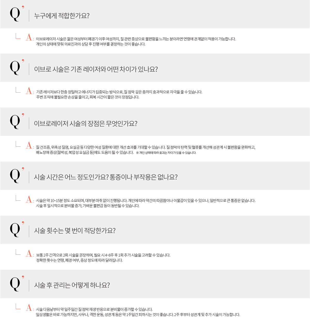 이브로 레이저는 레이저 열 에너지를 이용해 질 점막을 부드럽게 자극하고, 콜라겐과 엘라스틴 생성을 촉진하는 레이저 시술입니다. 질 내부의 자연적인 재생 작용을 유도하여 질 건조증, 가려움증, 이완 증상 등을 완화하고 전반적인 여성 건강 증진에 도움을 줍니다.